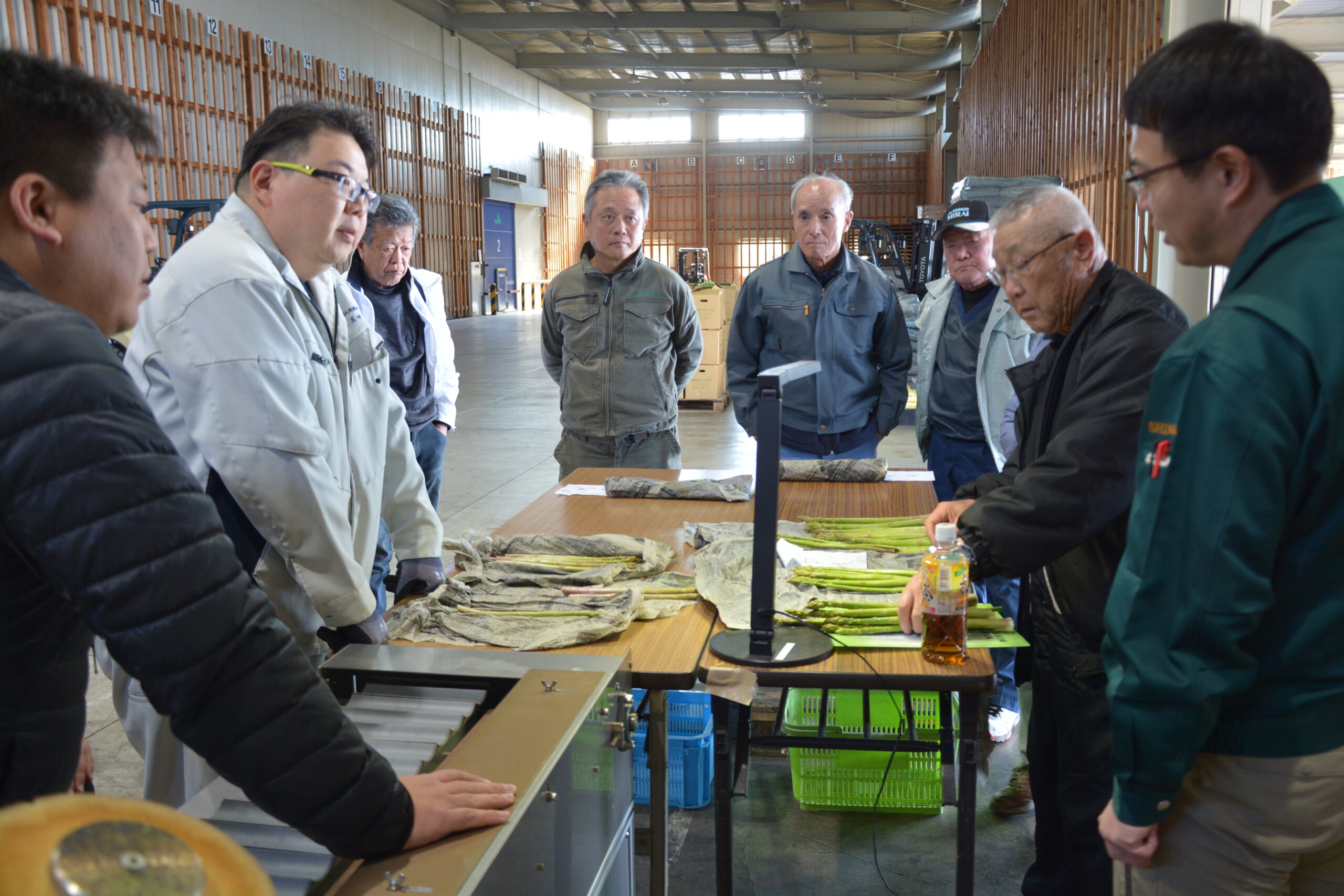 加西低温農業倉庫と小野営農生活センターで特産「みらいちゃんアスパラ」の出荷説明・目あわせ会を開催しました。生産者は栽培管理や出荷規格などを確認し、意思統一を図りました。各直売所にもいよいよアスパラの登場です。