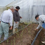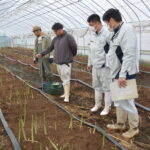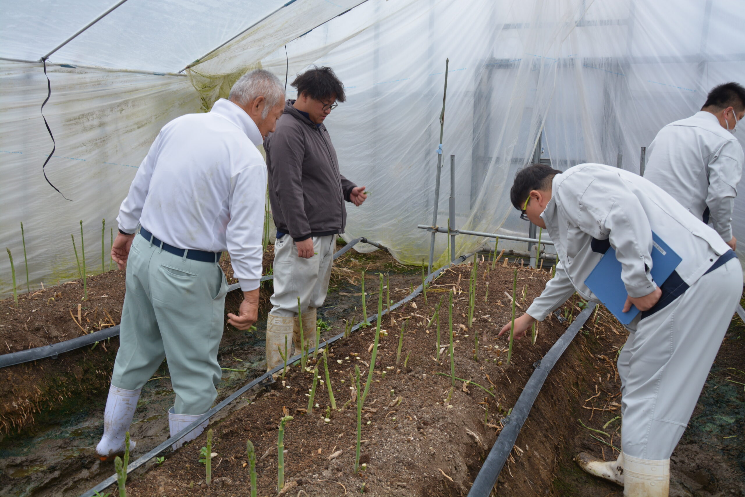 特産「みらいちゃんアスパラ」の圃場を職員が巡回し、生育状況などを丁寧に確認。今後の栽培管理などを生産者と意見交換し、アドバイスしました。アスパラの夏芽出荷に向け、より一層の品質向上をめざします。